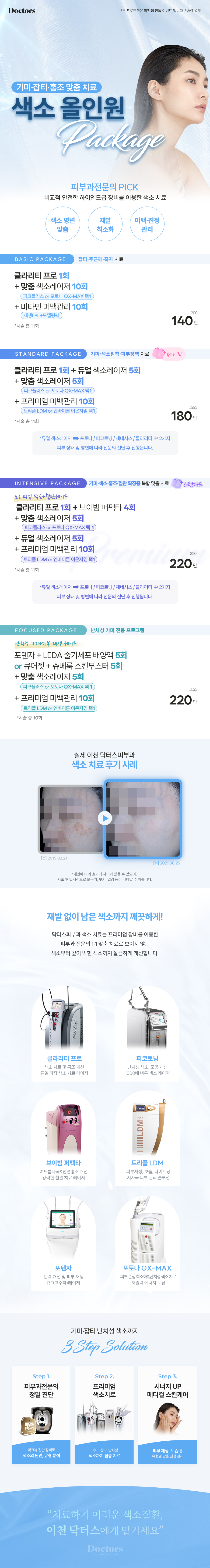 (시술 총 11회) 듀얼 색소레이저: 포토나, 피코토닝, 제네시스, 클라리티 중 2가지 / 맞춤 색소레이저: 피코플러스 or 포토나 QX-MAX 중 택 1 / 프리미엄 미백관리: 트리플 LDM or 엔바이론 이온자임 중 택 1